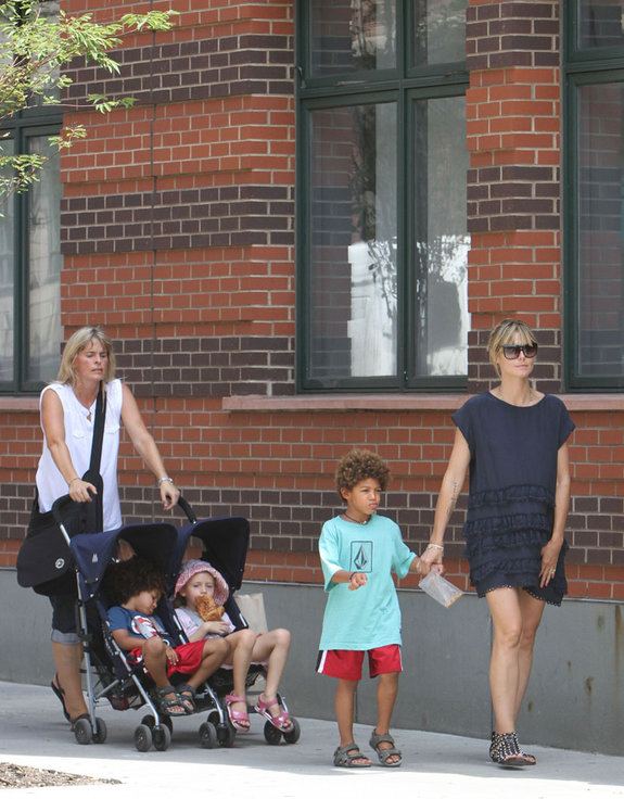 Model mom Heidi Klum was spotted strolling with her four children - Leni, 6, Henry, 4 1/2, Johan, 3 1/2, and Lou, 9 months - along with a family member and the nanny in New York City on Monday (July 19).